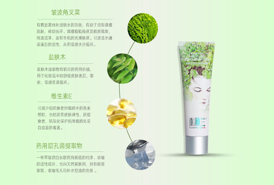 皱波角叉菜有着显著地补湿锁水的功效;盐肤木提取物能舒缓皮肤表层,散瘀,促进血液循环;药用层孔菌具有收敛紧致、收缩毛孔和补水控油的功效。多种草本精华经由高科技精粹形成完美的美肤功效,辅之以维生素E与透明质酸的美肤功效,可减少组织衰老时细胞中的色素颗粒,也能改善皮肤弹性,延缓衰老,抗氧化保护机体细胞免受自由基的毒害。
