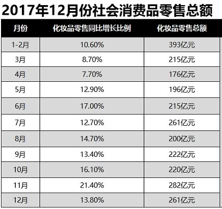 昨日国家统计局发布了2017年12月份社会消费品零售总额及增长数据。数据显示,2017年全年,社会消费品零售总额为366262亿元,比上年增长10.2%。其中,化妆品零售总额达到2514亿元,同比增长13.5%。